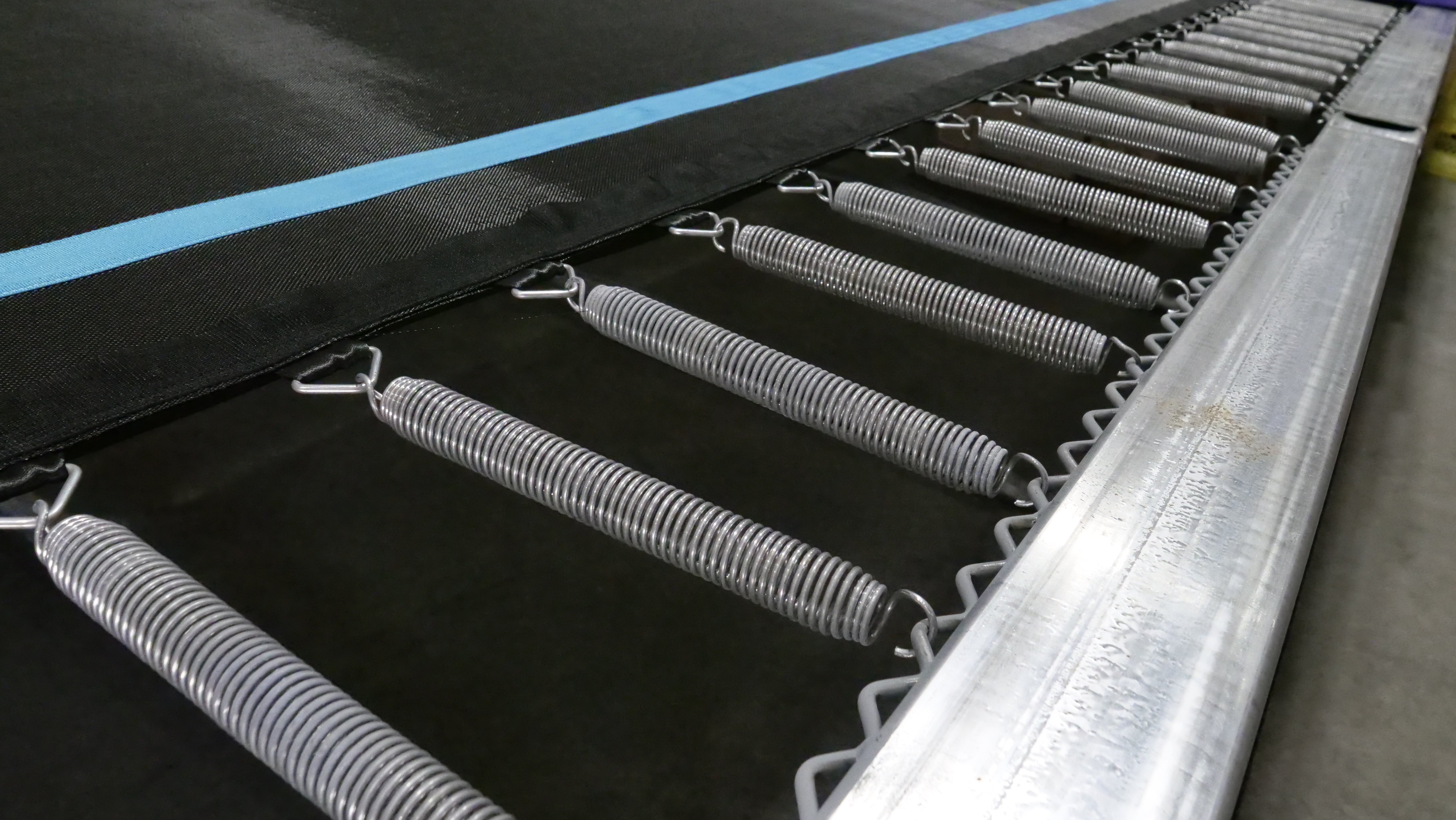 Our polypropylene fabric is sourced from a top USA manufacturer, meeting ASTM F2970 standards for trampoline park use. Canadian-made galvanized triangles with 2" nylon webbing connect steel springs. Premium UK polyester thread reinforces components for durability.
